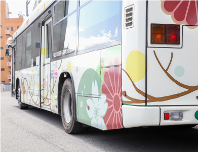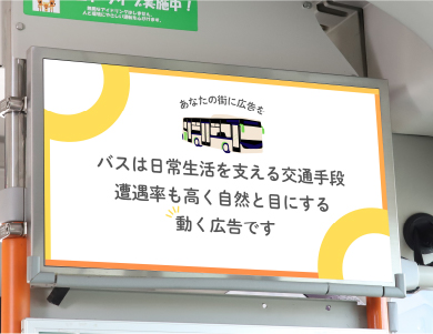 バスの側面や後部に掲出される看板・ステッカー広告です。行き交うバスによる反復効果で、さらに一層の訴求が期待できます。乗車待ちのお客様や後続車のドライバーなどへピンポイントにアプローチし、地域密着の宣伝に最適です。