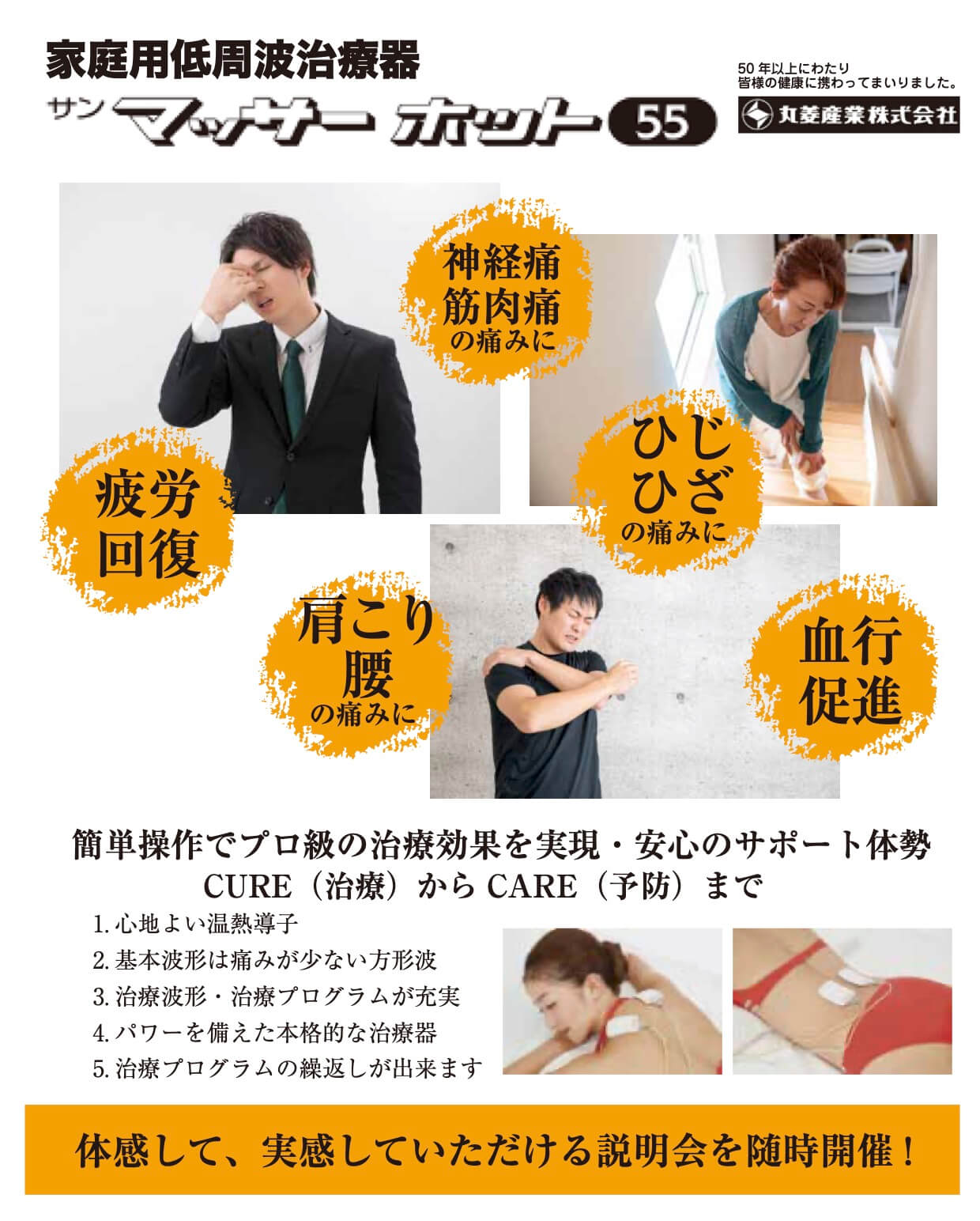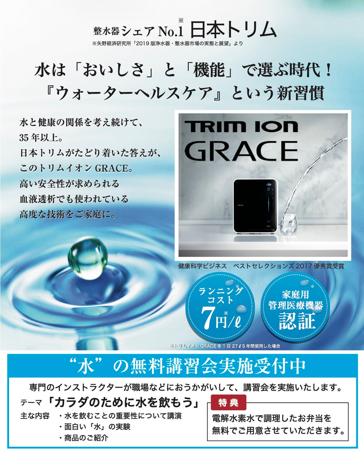 弊社では、お客様の健康を支える、電解水素水整水器のトリムイオン、低周波治療器サンマッサーを取り扱っています。出張展示説明会も開催しております。